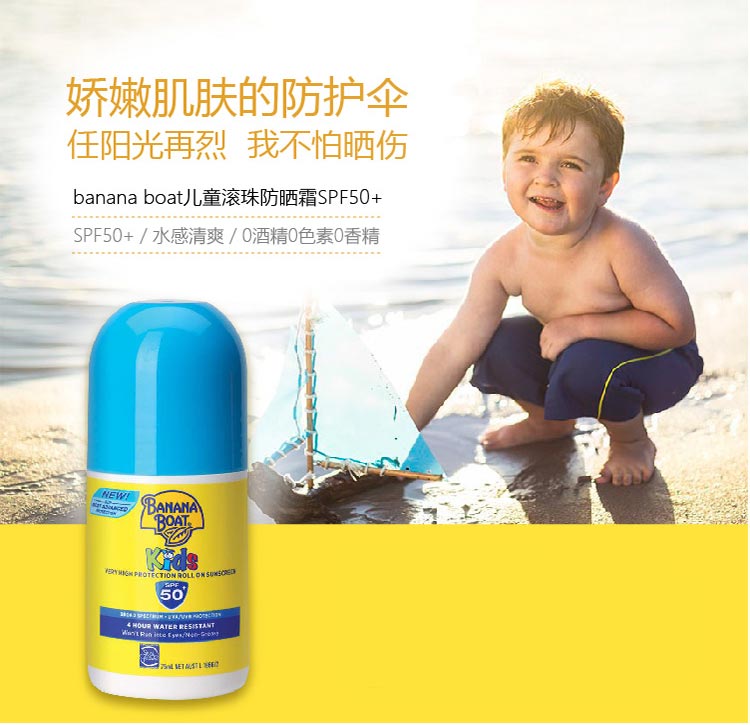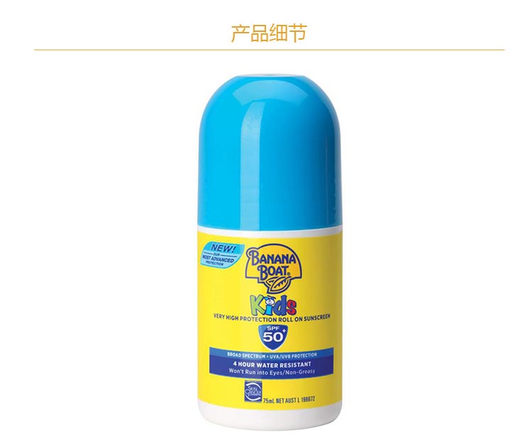 【产品名称】Banana Boat Kids SPF50+ (蓝色3岁以上) Banana Boat Baby SPF50+ (粉色0-3岁) 【中文名称】香蕉船 儿童防晒霜SPF50+ 【规 格】75ml(无密封/无外包装) 【防晒指数】SPF50+ 【适合人群】3岁以上任何肌肤的宝宝与儿童及敏感肌肤成人 【保 质 期】三年 【产 地】澳大利亚 【产品介绍】 经儿科医师验证-非常温和的防晒霜适用于儿童,成人敏感皮肤也可以用的喔。无泪配方长效呵护不含PABA,香料及油分,香蕉船儿童SPF50+提供了强大的防晒效果,保护宝宝的娇嫩的皮肤,气味温和,充满乐趣的滚珠设计,能让宝宝们爱上涂防晒。 ◆温和,不油腻、不刺激双眼 ◆非常高保护的SPF 50+防晒 ◆提供强大的UVA和UVB保护 ◆不含香精 ◆4小时长时间防水 本产品为纯物理防晒剂,不含PABA(对氨基苯甲酸),香料等化学品,使用时不会被皮肤吸收,能够在皮肤表面可形成一层保护层; 本产品不含油分,使用舒适,无油腻感; 防晒范围广泛:可有效阻挡290nm-380nm范围内的UVB和UVA,既可以防止晒伤,又可以防止晒黑!全面有效的阻挡紫外线对皮肤造成的损伤,防止皮肤光老化。 【使用方法】 均匀地涂在肌肤上,涂上后15分钟才暴露在太阳下,游泳、抹身或隔一段时间应重覆涂抹以达至最佳防晒效果。