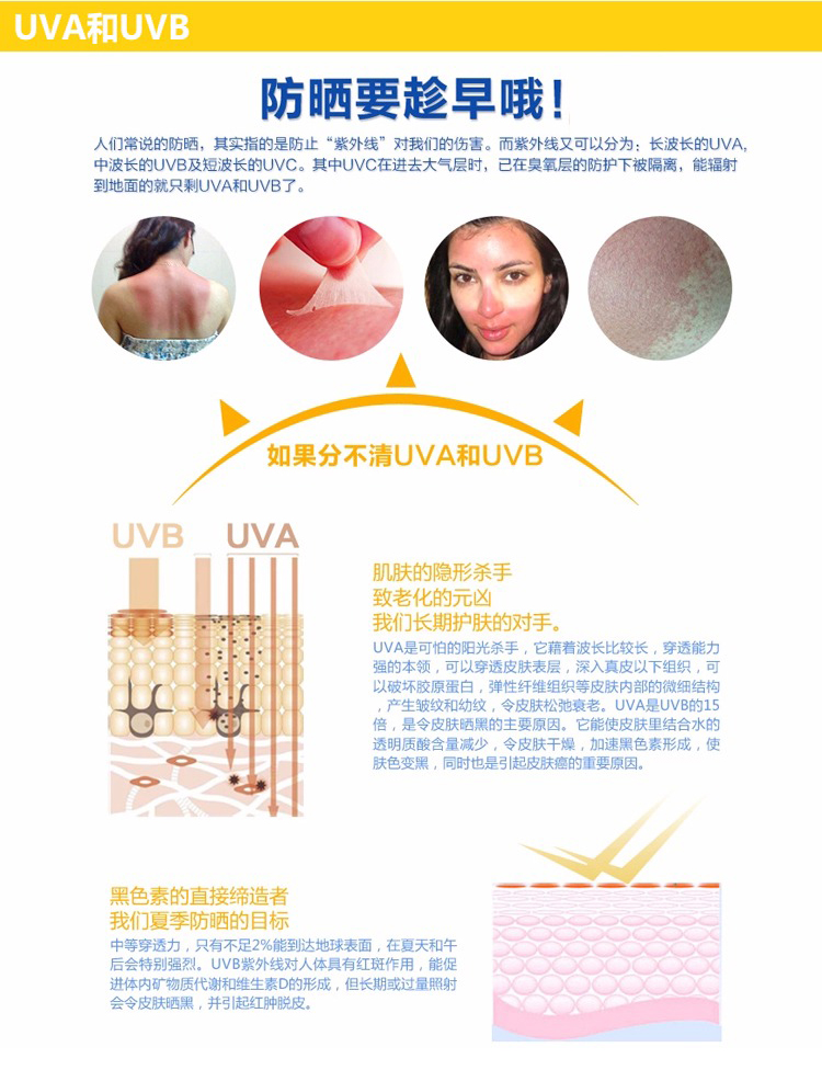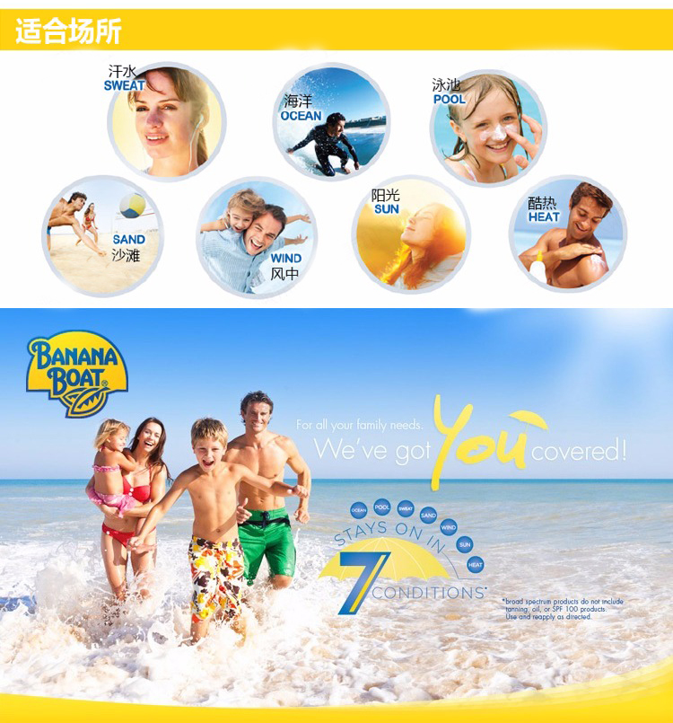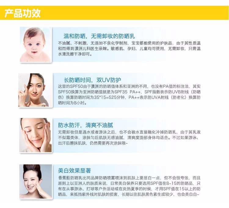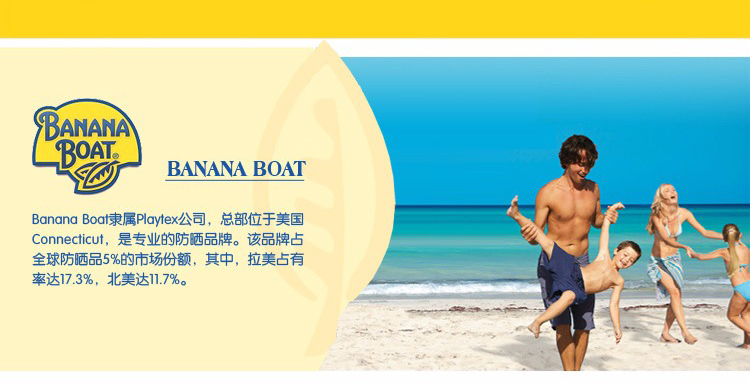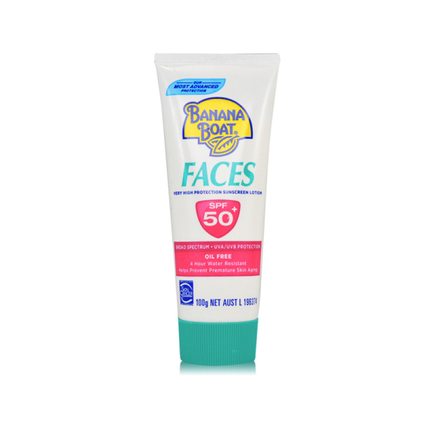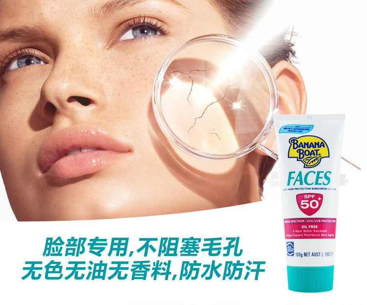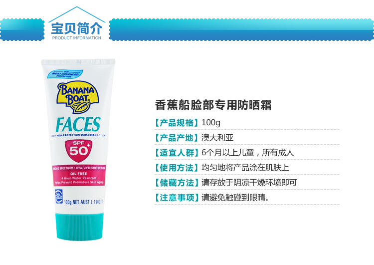 【产品名称】澳洲 香蕉船Banana Boat Faces 面部防晒霜SPF50+ 无油配方 【规 格】:100g 【产 地】:澳大利亚 【适合人群】:6个月以上儿童,所有成人 【特 点】:有效地阻挡UVA/UVB,4小时防水,无油配方,请避免触碰到眼睛。 【品牌说明】:BANANA BOAT系列的防晒用品几乎占领了澳洲整个夏日防晒市场。只要去超市或者药房,满货架的防晒用品几乎都是BANANA BOAT系列。要知道澳洲的太阳紫外线是全球有名的厉害,而且澳大利亚是皮肤癌高发国!所以这里出生的宝宝从小就要涂抹防晒用品,尤其在夏天时候。澳大利亚防癌理事会建议,婴幼儿( 0-12个月)暴露于紫外线辐射的一天受到保护,他们从出生开始,因尽可能远离太阳紫外线。当无法做到这一点,尽量穿着衣服,佩带帽子以保护的宝宝脸部,脖子和耳朵。 【产品功效】: 1、 能广泛抵挡UVAI、UVAII、UVB紫外线 2、 可在化妆前使用 3、 能减少对皮肤的刺激性 4、 不油腻、不会阻塞毛孔,无色,无油,无香料,防水 5、 不含PABA 【产品介绍】: *这款防晒霜非常适合夏日海边、烈日下使用。不含PABA,香料及油分。光谱抗紫外线的效果,让您的肌肤在骄阳下无后顾之忧。 *Super Light超薄,超透气,完全没有普通防晒霜的厚腻感,肌肤感觉不到任何束缚。无油配方,不油腻,不堵塞毛孔。 * Absorbs Quickly吸收快。 * Fragrance Free无香精配方,抗过敏,纯物理防晒剂,不含PABA (对氨基苯甲酸),不会被皮肤吸收,只在皮肤表面形成一层保护屏障。 * SPF50,UVA / UVB防护,防止皮肤因阳光过度照射引起衰老,美国抗皮肤癌协会推荐,有效防止皮肤癌。 * 长达4小时防水! 【使用方法】:均匀地将产品涂在肌肤上,涂后15-20分钟后才暴露在太阳下,隔一段时间应重复涂抹如有需要的话,防晒效果更好