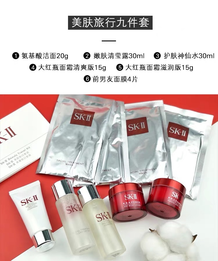 【香港仓】「香港直邮」SK-II美肤旅行套装 中样套盒9件套(前男友面膜*4+神仙水30ml+清莹露30ml+清爽型日霜15g+滋润型晚霜15g+洗面奶 中样20g)(礼盒装无塑封)